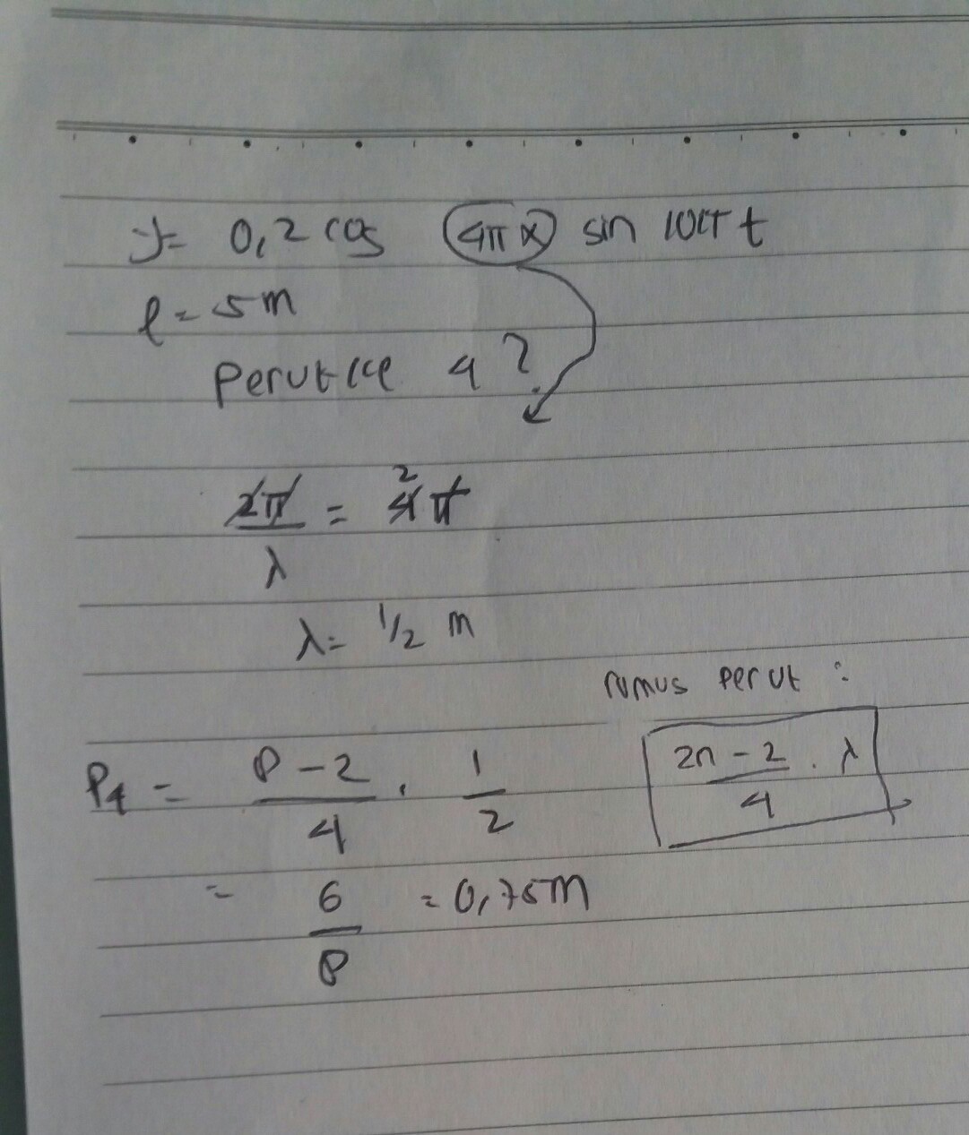 Suatu gelombang mempunyai persamaan y = 0,2 cos (4πx) sin (5πt).